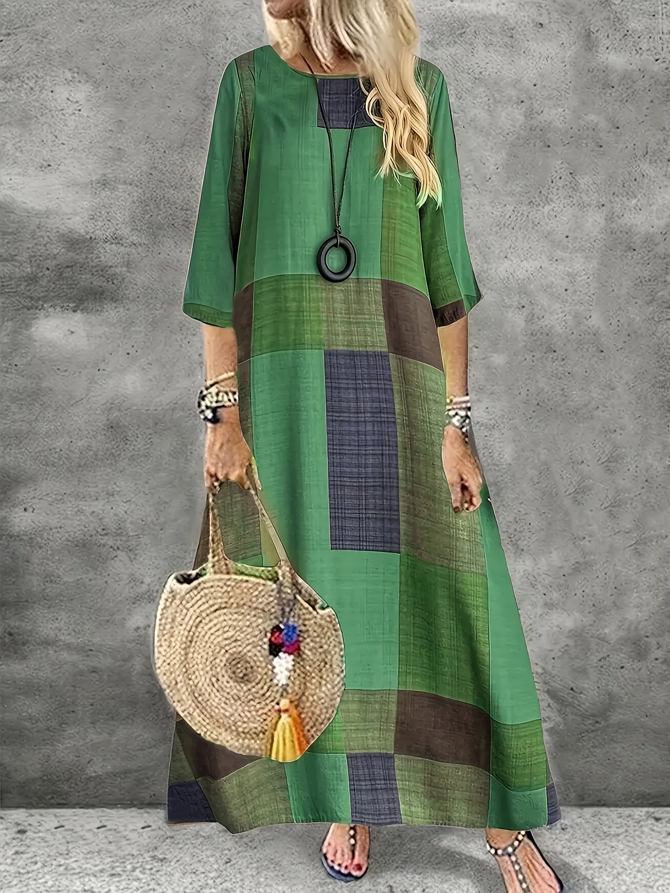 With its rich green tones and soft plaid patchwork design, this dress adds earthy elegance to your everyday style. The oversized silhouette flows beautifully, making it perfect for relaxed days with a stylish edge.