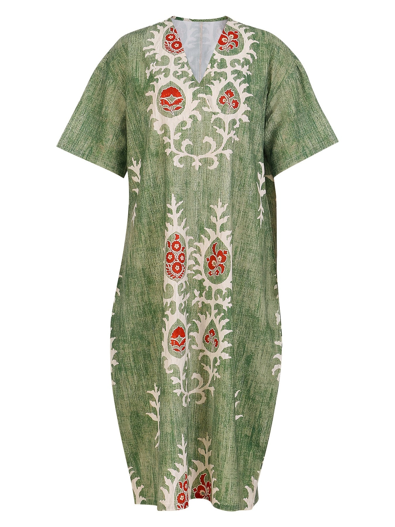 This beautifully earthy dress features a vintage-inspired botanical pattern over a crinkled olive backdrop, offering effortless charm and casual elegance. Its relaxed silhouette and artisanal vibe make it perfect for warm, soulful days.