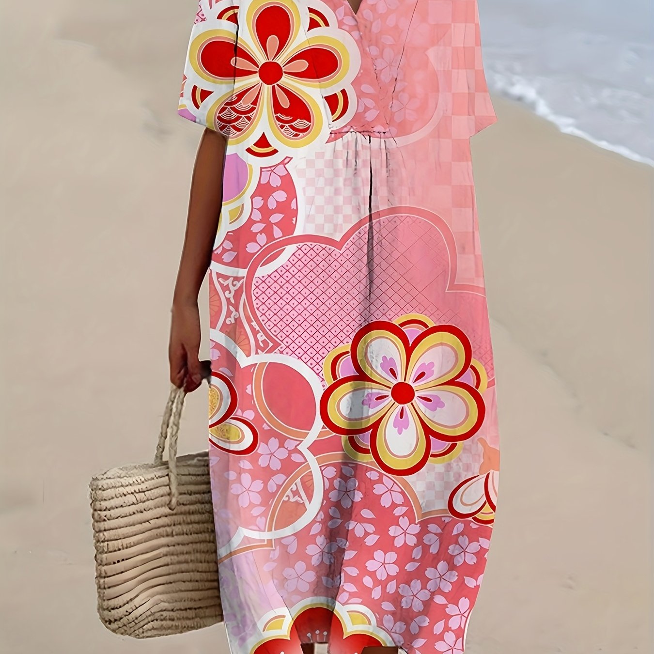 Add a splash of color to your summer wardrobe with this wrap-inspired dress, blending retro floral patterns with dreamy pink tones. The flowy shape and flattering V-neck make it your go-to for laid-back yet stylish days.