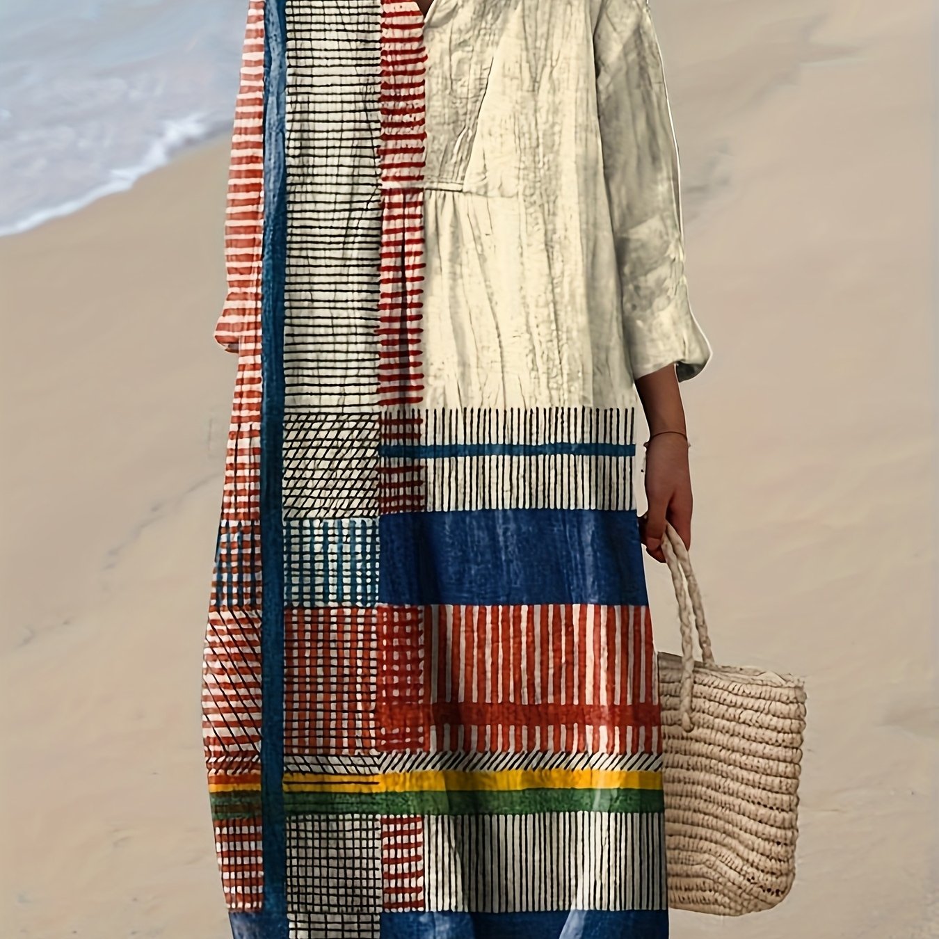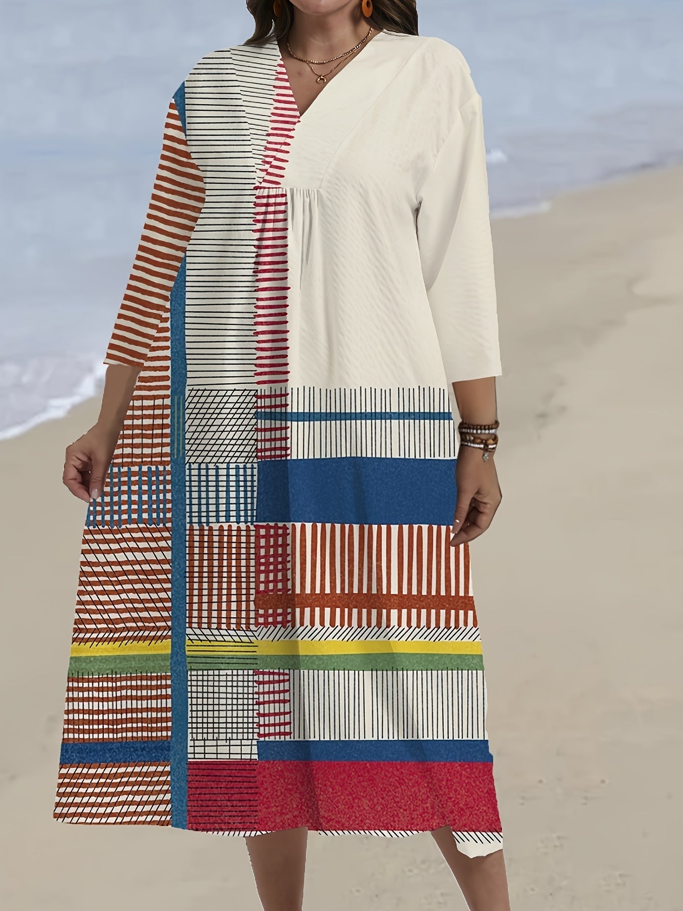 This artistic maxi dress blends hand-drawn stripes and bold color blocks for a look that feels both modern and soulful. With a relaxed shape and natural crinkle texture, it’s your new favorite for effortless, statement-ready days.